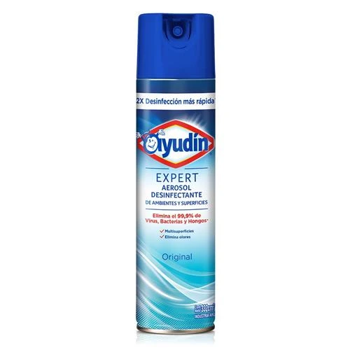 "El Aerosol Desinfectante Ayudín® Expert Desinfecta 2x Veces Más Rapido. Su Fórmula Especialmente Diseñada Elimina Olores Y El 99.9% De Virus*, Bacterias** Y Hongos***, Inclusive El Virus Causante Del Covid19.Ideal Para Uso En Ambientes Y Superficies Como Cocinas, Salas, Habitaciones, Oficinas, Zonas De Lavado Y Baños; Computadoras, Teléfonos, Manijas/Picaportes, Basureros, Controles Remotos, Juguetes De Plástico; Calzado (Zapatillas, Suelas De Calzado), Mochilas Y Carteras, Exterior De Bolsas De Compras. Indicado También Para Muebles: Armarios/Closets, Bibliotecas/Libreros, Mesas Y Camas.El Aerosol Desinfectante Ayudín® Expert Se Presenta En Tres Fragancias, Original, Bebé Y Frescura Matinal. Su Tamaño Pequeño Es Ideal Para Llevarlo Fuera De La Casa, Para Estar Protegido En Todo Momento. Su Tamaño Grande Es Ideal Para Usarlo En Todos Los Ambientes Y Superficies De La Casa. *Virus: Influenza A, Virus Respiratorio Sincicial (Vrs), Virus Herpes Simplex Tipo 1, Rhinovirus Y Sars-Cov-2.**Bacterias: Staphylococcus Aureus, Salmonella Choleraesius, Pseudomonas Aeruginosa, Escherichia Coli, Klebsiella Pneumoniae, Enterococcus Faecalis.Hongos: Tricophyton Mentagrophytes Vs Producto Actual. (Resultados De Eliminación De Bacterias A 5 Min Vs 10 Min)