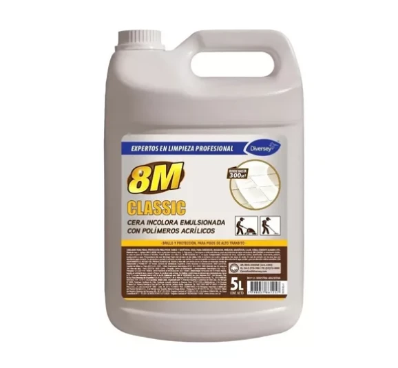 8M Classic es una emulsión lustrable formulada con exclusivos polímeros acrílicos, ceras minerales y sintéticas de alta calidad, de fácil aplicación que da brillo sin necesidad de lustrar. Seca rápidamente formando una película dura y autobrillante sin necesidad de repasar, resaltando el color natural tanto de pisos duros como flexibles. Forma un film protector resistente al agua y a los detergentes neutros, que rechaza la suciedad y las marcas negras producidas por suelas de zapatos o ruedas de goma de carros o carretas. La elevada concentración de polímeros acrílicos le confiere extraordinaria resistencia al tráfico, minimizando marcas y rayones, mientras que la justa proporción de ceras permite reparar fácilmente las películas transitadas y aumentar notablemente su brillo mediante el uso de una lustradora de baja velocidad (165 – 300 rpm).