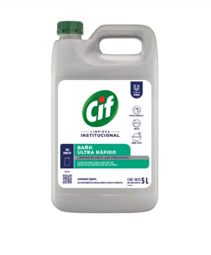 Limpiador líquido de rápida acción con una avanzada formula diseñada para actuar de forma fácil rápida y sin refregar sobre los distintos tipos de suciedad del baño. Formulado con activos biodegradables.Limpia y desodoriza en un solo paso. Remueve restos de jabón marcas de manos marcas de pastas de dientes y sarro en superficies de bañera lavatorio azulejos inodoro mampara bidet y grifería de manera fácil y rápida. Su uso frecuente elimina eficazmente los depósitos de sarro previene su futura formación y deja brillantes las superficies tratadas. La nueva fragancia de CIF Baño posee una tecnología antiolor