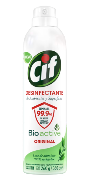 El nuevo Cif Aerosol Desinfectante de Ambientes y Superficies garantiza máxima efectividad eliminando el 99,9% de hongos, virus y bacterias del hogar con su Tecnología BioActive y fragancia 100% biodegradable con ingredientes naturales. Los ambientes y superficies que se pueden desinfectar con el nuevo Cif Aerosol Desinfectante son: • En el baño: lavatorios, mamparas, azulejos y grifería • En la cocina: mesadas, cesto de basura • Ambientes: habitaciones, garage, living, dormitorios, ambientes cerrados, sótanos y bauleras. • Objetos: picaportes, sillas, placards, escritorios, sillones, colchones, sabanas, cortinas. Todo lo que vivis durante el día llega a cada parte de tu casa, los virus y bacterias también. Si lográs incorporar este nuevo Cif Aerosol Desinfectante a tu rutina de aseo frecuente, conseguirás un hogar seguro, libre de hongos, virus y bacterias, con una fragancia fresca, natural y duradera. Para un mejor modo de uso del nuevo Cif Aerosol Desinfectante: Agite bien antes de usar. Para acción desinfectante mantenga el envase en posición vertical y aplique el producto sobre la superficie a tratar durante 3 o 4 segundos, desde una distancia de 15 cm a 20 cm. Deje actuar por 10 minutos. Para acción desodorizante: mantenga el envase en posición vertical y aplique cif desinfectante de ambientes y superficies sobre la superficie a tratar durante 3 o 4 segundos. Si lo utiliza para el tratamiento de superficies en contacto con alimentos, enjuague con abundante agua potable. Precaución: no aplicar sobre maderas ni cueros.