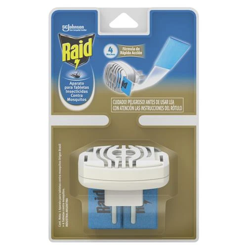 RAID Tabletas Repele Los Mosquitos Por Hasta 12 Horas. Perfecto Contra: *Mosquitos Beneficios: 1.Mata Y Repele 2.Protección Toda La Noche (Hasta 12 Horas De Protección Por Noche) 3.Mata Mosquitos Ocultos 4.Fácil De Usar. Instrucciones De Uso: 1. Retire La Tableta Del Envoltorio. 2. Introduzca La Tableta En El Aparato. 3. Enchufe El Aparato, De Modo Que La Tableta Permanezca Horizontal. 4. Luego De 12 Horas, Cuando La Tableta Pierda El Color Azul, Remueva La Tableta Usada Empujándola Con Una Nueva. 5. Almacene El Producto En Un Lugar Fresco Y Seco.