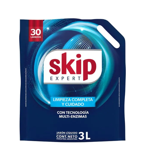 Skip está en constante evolución para ofrecer la mejor tecnología en el lavado de la ropa. El nuevo jabón líquido Skip Bio-Enzimas, tiene una nueva tecnología que garantiza la superioridad en la limpieza y cuidado de las fibras, asegurando un impacto positivo en el planeta.Con enzimas de origen natural y una fórmula y fragancia biodegradable. La acción biológica de las enzimas de origen natural, penetra en las fibras para limpiar profundamente y prevenir que las micro-partículas de suciedad queden atrapadas, logrando un cuidado superior: previene las pelotitas, colores más vivos y duraderos, limpieza más profunda, cuida tejidos y reduce el amarillentamiento. No importa cuál sea la combinación de fibras de tu ropa, con los jabones líquidos para ropa Skip Baja espuma podés obtener prendas implacablemente limpias y con su textura original preservada por mucho más tiempo. La avanzada tecnología de Skip líquido te asegura la limpieza y remoción de las manchas sin dañar las fibras de tu ropa. Dosificación: Una tapa al ras (100 ml) basta para una carga completa de ropa. Vierta el producto de limpieza en el compartimento de lavado de la gaveta de su lavarropa.Para lavado a mano utilice 1 tapa (100 ML) para una balde de agua (10 L). Para ropa muy sucia, dosifica 1 tapa y media (150 ml). Si se presentan manchas difíciles, aplique el producto directamente sobre las manchas.