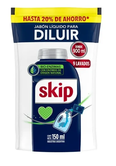 Nuevo Jabón Líquido para Diluir SKIP Bio-Enzimas (Doypack) con tecnología superior en limpieza y cuidado de las fibras. El jabón líquido Skip para diluir, ofrece el mismo cuidado de siempre en un formato más conveniente. Ahora en su nueva presentación de 150 ml rinde 900 ml = 9 lavados. Skip Bio- Enzimas es MÁS ECONÓMICO: 20% de ahorro por lavado versus envase de 800 ml. MÁS PRÁCTICO: Más fácil de transportar y almacenar. MÁS ECOLÓGICO: Fórmula y fragancia biodegradable y enzimas de origen natural. La acción biológica de las enzimas de origen natural, penetra en las fibras para limpiar profundamente y prevenir que las micro partículas de suciedad queden atrapadas, logrando un cuidado superior. Beneficios: Limpieza más profunda, previene pelotitas, cuida tejidos, reduce el amarillentamiento, colores vivos y duraderos, fórmula y fragancia biodegradable. SKIP Bio-Enzimas jabón líquido es muy fácil de preparar: Coloque 750 ml de agua potable en una botella vacía de Skip, agregue 150 ml de Skip Líquido para diluir dentro de la botella, cierre la botella, agite 5 veces ¡y listo para usar! Dosifique 100 ml para una carga de ropa completa o 150 ml para ropa muy sucia. SKIP no solo lava la ropa, también la cuida.