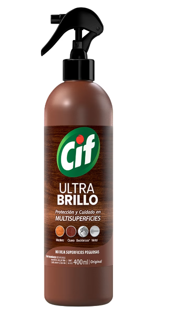 Cif Ultra Brillo Multisuperficies Original Eco Spray ofrece un mix sofisticado y moderno para limpiar tus superficies delicadas. Probado en más de 18 superficies como cuero, madera, metal, acero inoxidable, plástico, vidrio, bronce, aluminio, cobre, mármol, espejos, porcelanato, granito, vinilo y laminado, entre otras. Removiendo el polvo, garantizando alta protección y cuidado, sin dejar residuos. CIF, experto en limpieza, cuidado y belleza ha desarrollado un lustramueble en formato spray recargable. Su nuevo pack posee una recarga económica para limpiar todas tus superficies. Para una experiencia de uso ideal corte el envase por la línea punteada; desenrosque el gatillo de su botella de CIF Ultra Brillo; vierta con cuidado el contenido de la recarga en su botella de CIF Lustramueble; coloque el gatillo; Aplique el producto directamente sobre la superficie a limpiar y luego pase un paño suave (tipo CIF Ballerina) hasta secar. El Eco Spray recargable podes usarlo las veces que quieras generando menos residuos. Con Cif Ultra Brillo las superficies brillan y la suciedad desaparece ¡Chau polvo y residuos, bienvenida belleza! Advertencias: no mezclar con un limpiador multisuperficies, en caso de contacto con los ojos y/o piel lave inmediatamente con abundante agua. Si tiene piel sensible use guantes de goma. Encontralo en formato Doypack 380ml.