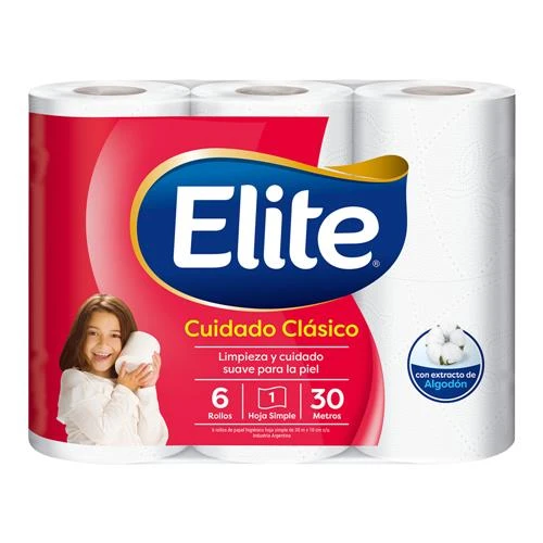 Papel Higiénico ELITE Cuidado Clásico Hoja Simple 30 Metros 6 Unid.